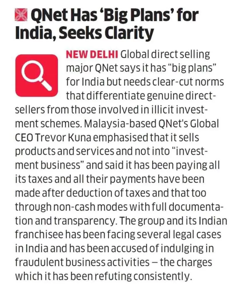 “QNET’s business model is sound and we stand by it. No fraud company can last this long. Unfortunately, a lack of proper legislation for direct selling in India has led to many companies including us being investigated under various Acts,” he added. He also pitched the idea of having an independent self-regulating trade body under the government to ensure all direct selling business comes under such guidelines.