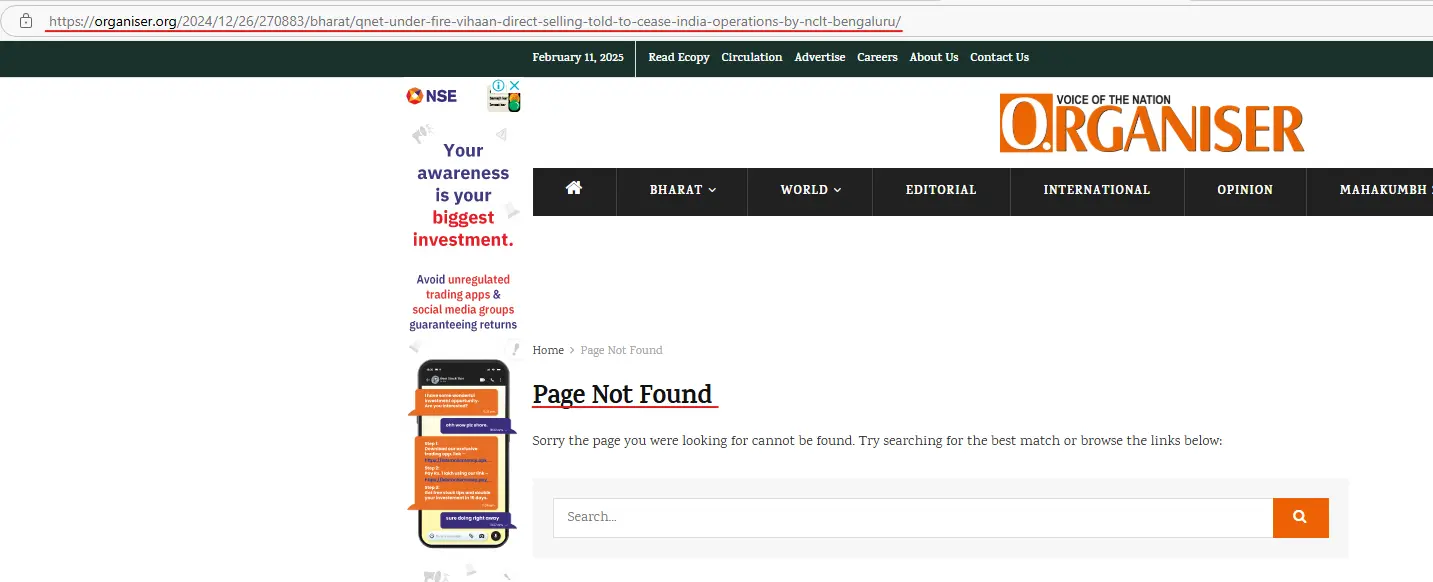 Organiser’s Defamatory News Link Against QNET India Franchisee Vihaan Removed