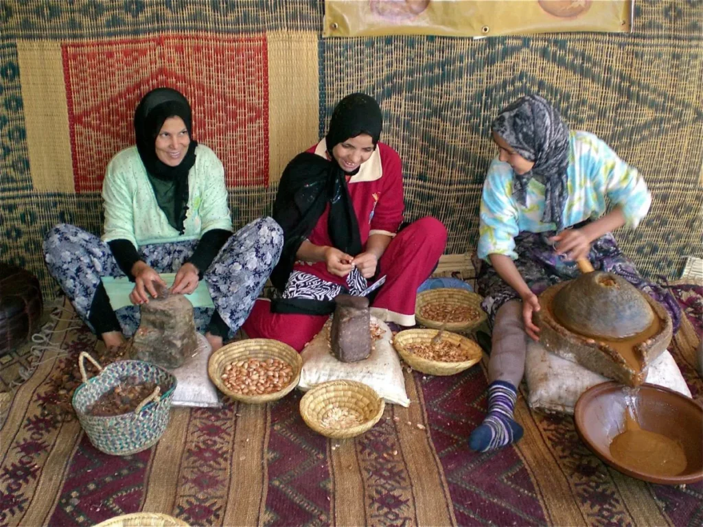The extraction of argan oil is a labor-intensive task perfected by the Berber women native to the area (it takes a few days to produce one liter) who work for fair-trade cooperatives, and use traditional knowledge and techniques in the extraction process.