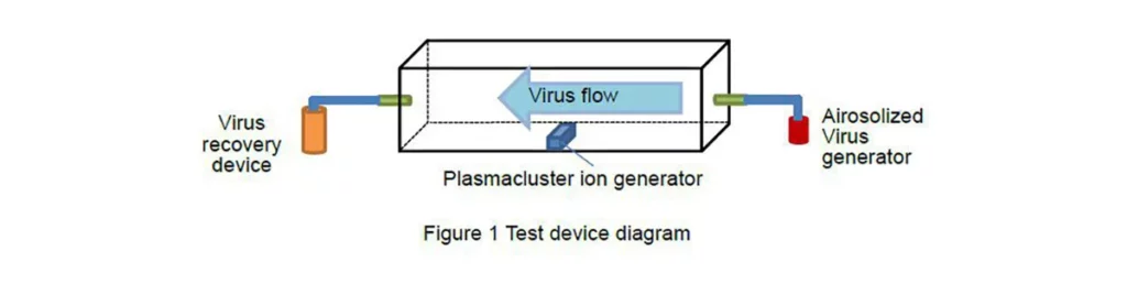 A verification test for monitoring viral activity before and after being exposed to Plasmacluster ions was readied wherein aerosolised virus solution is concentrated in the close proximity to the Plasmacluster ion generator. After passing the virus through the said generator, the solution is then collected in a recovery device.